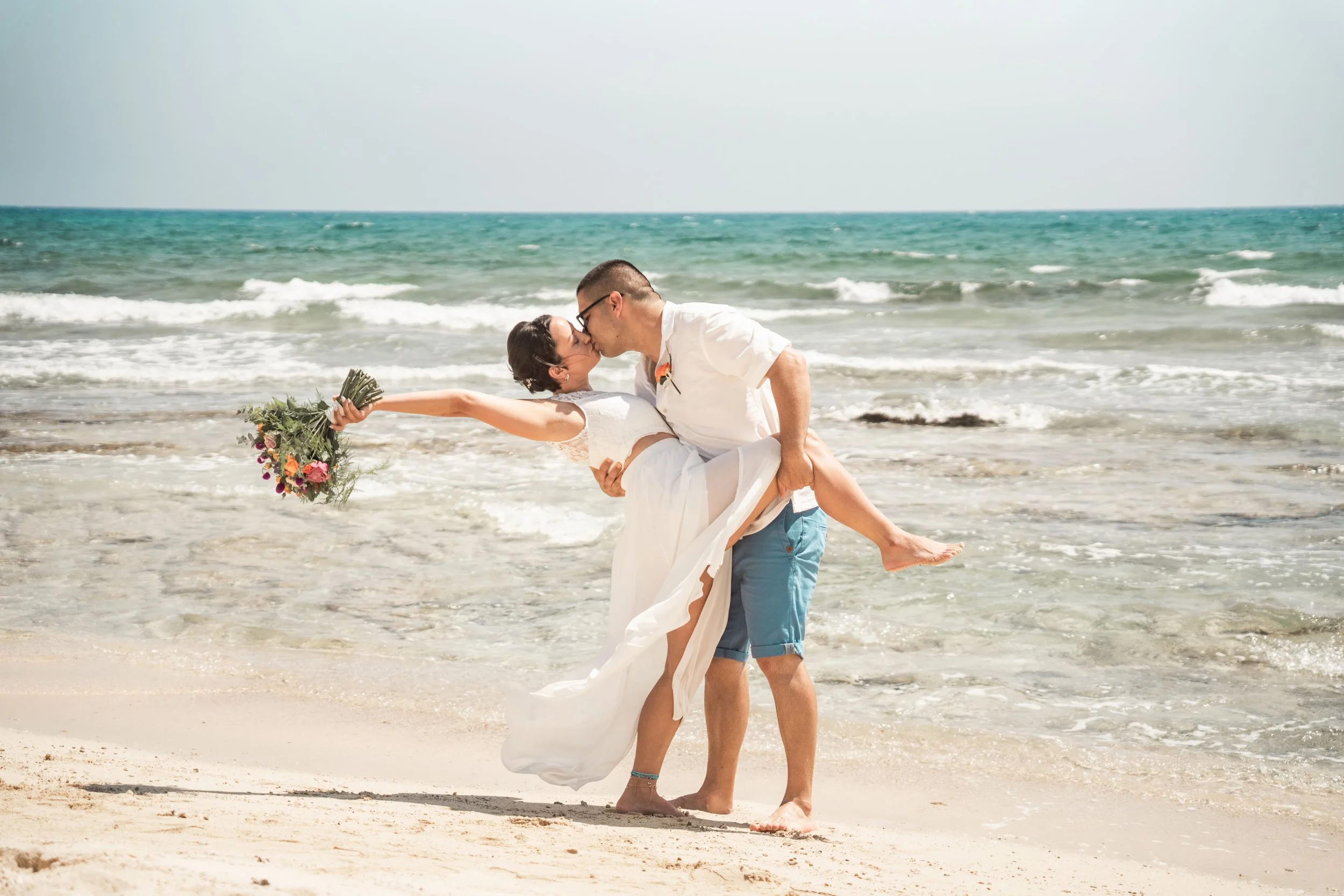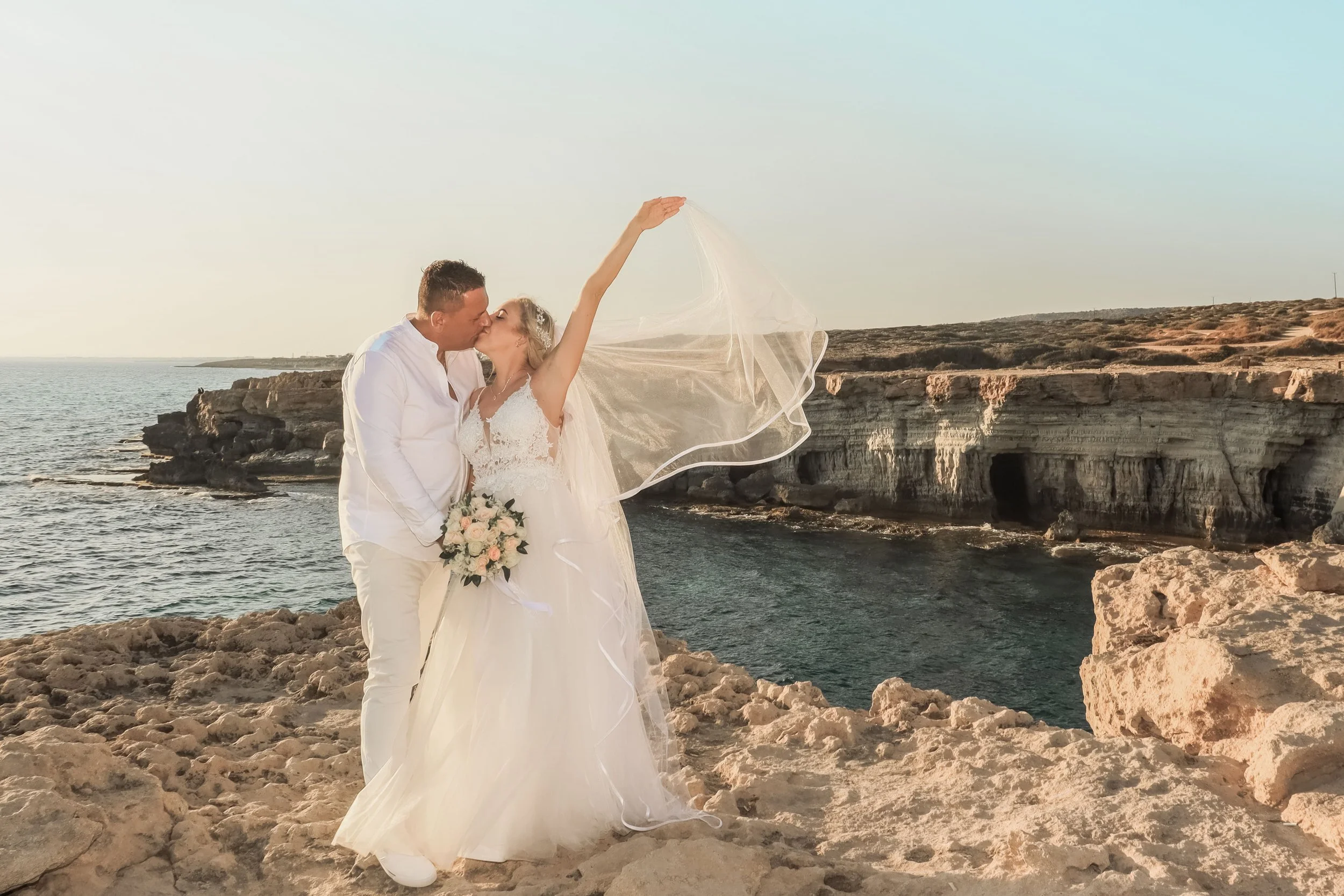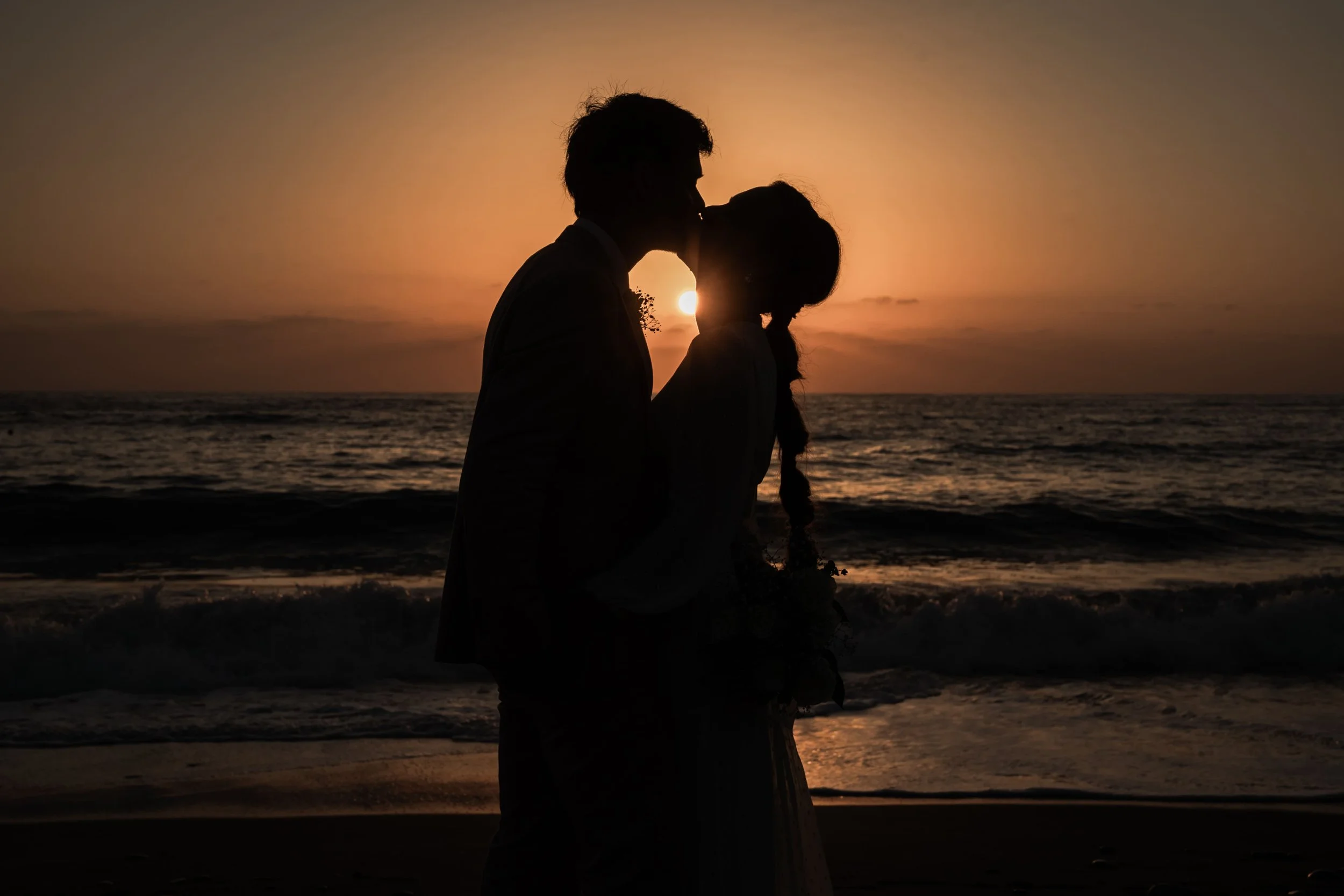 A couple kissing at sunset by the beach, with the woman holding a bouquet of white flowers.