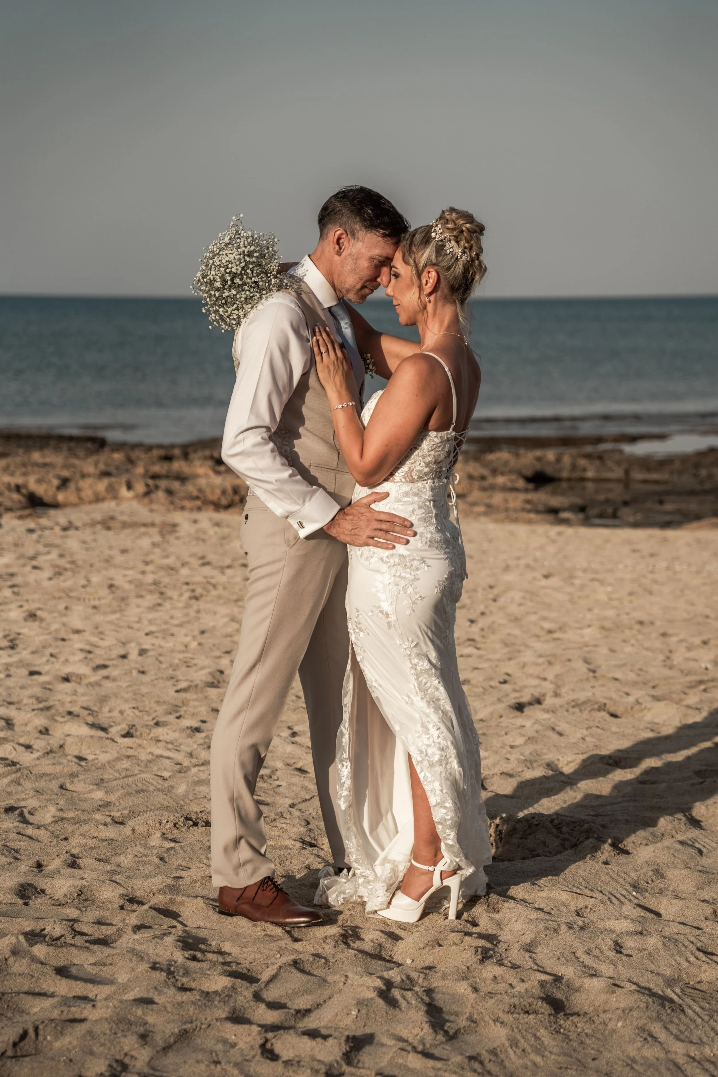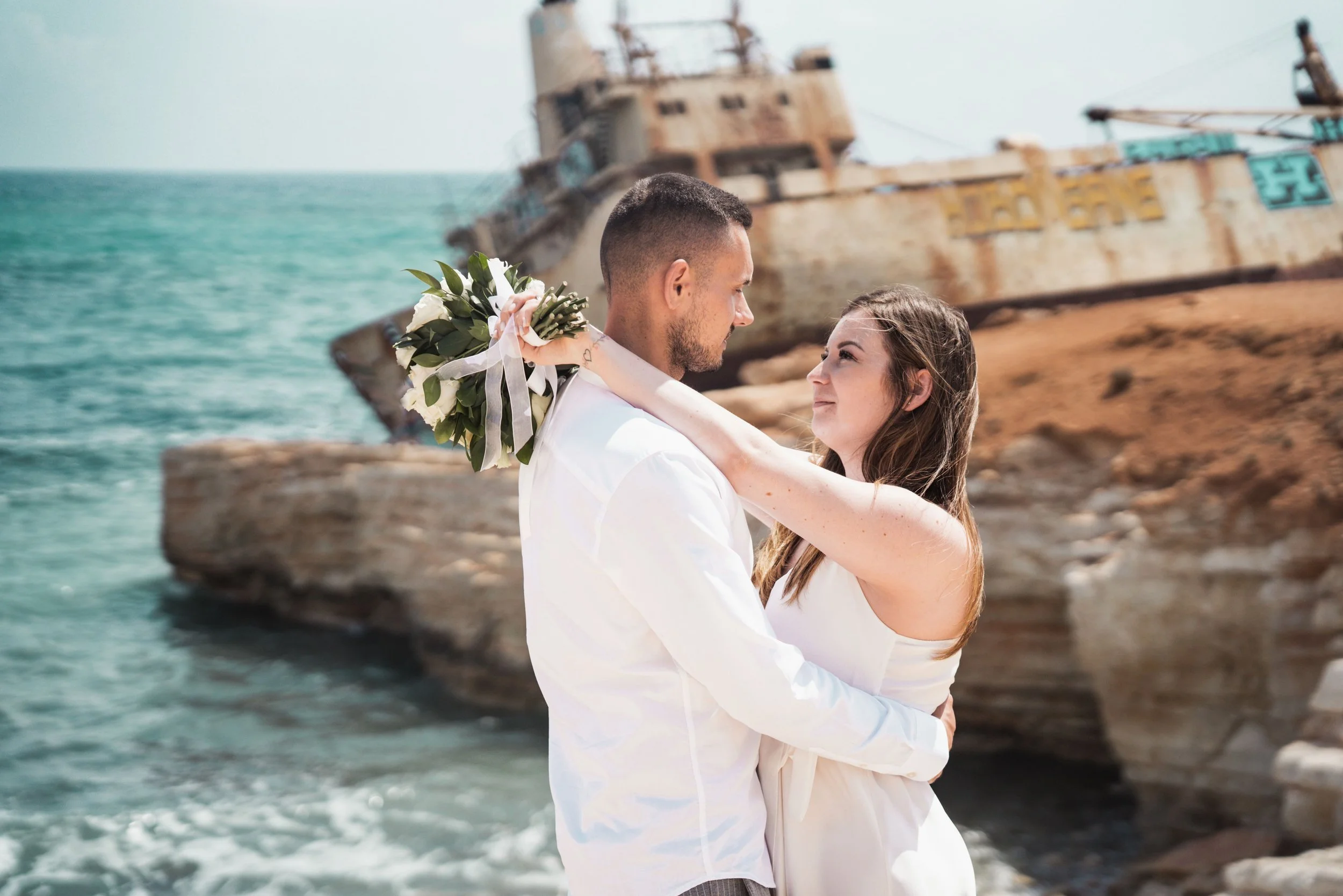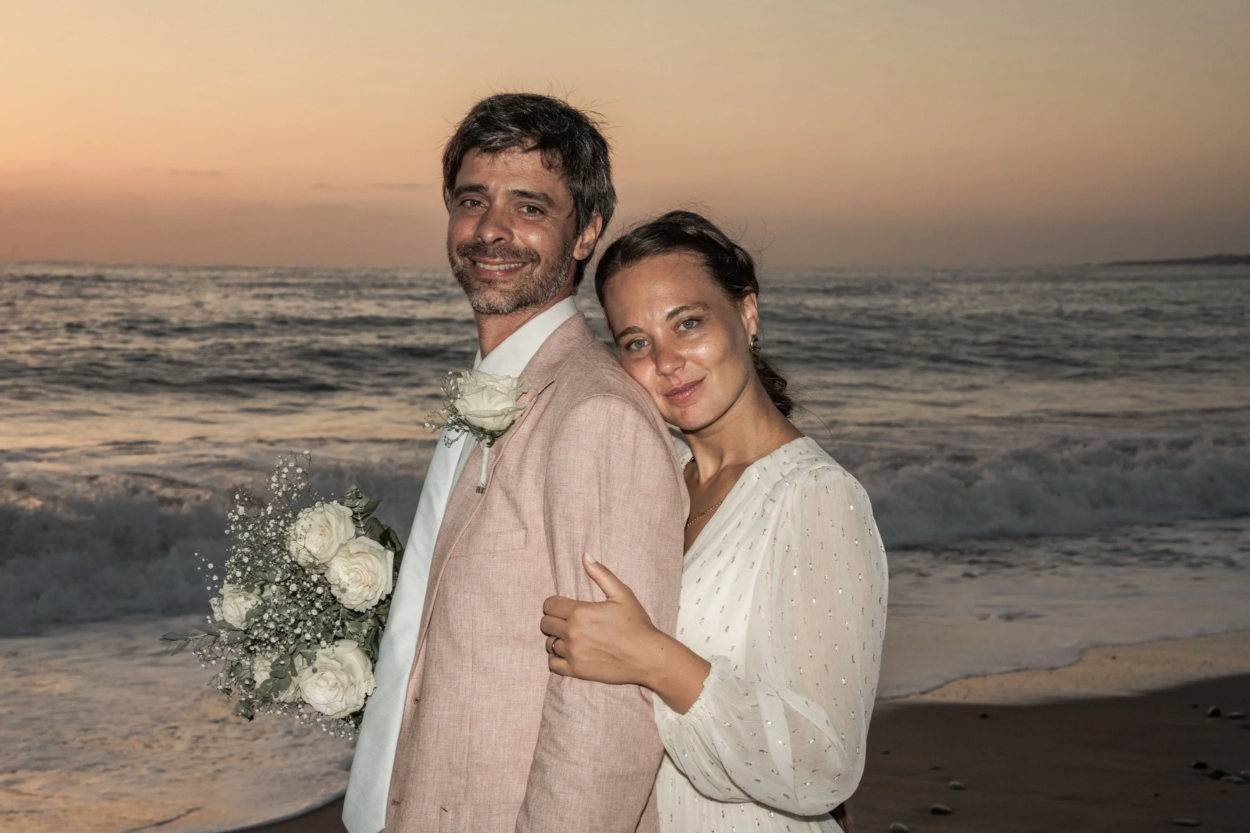 A couple kissing at sunset by the beach, with the woman holding a bouquet of white flowers.
