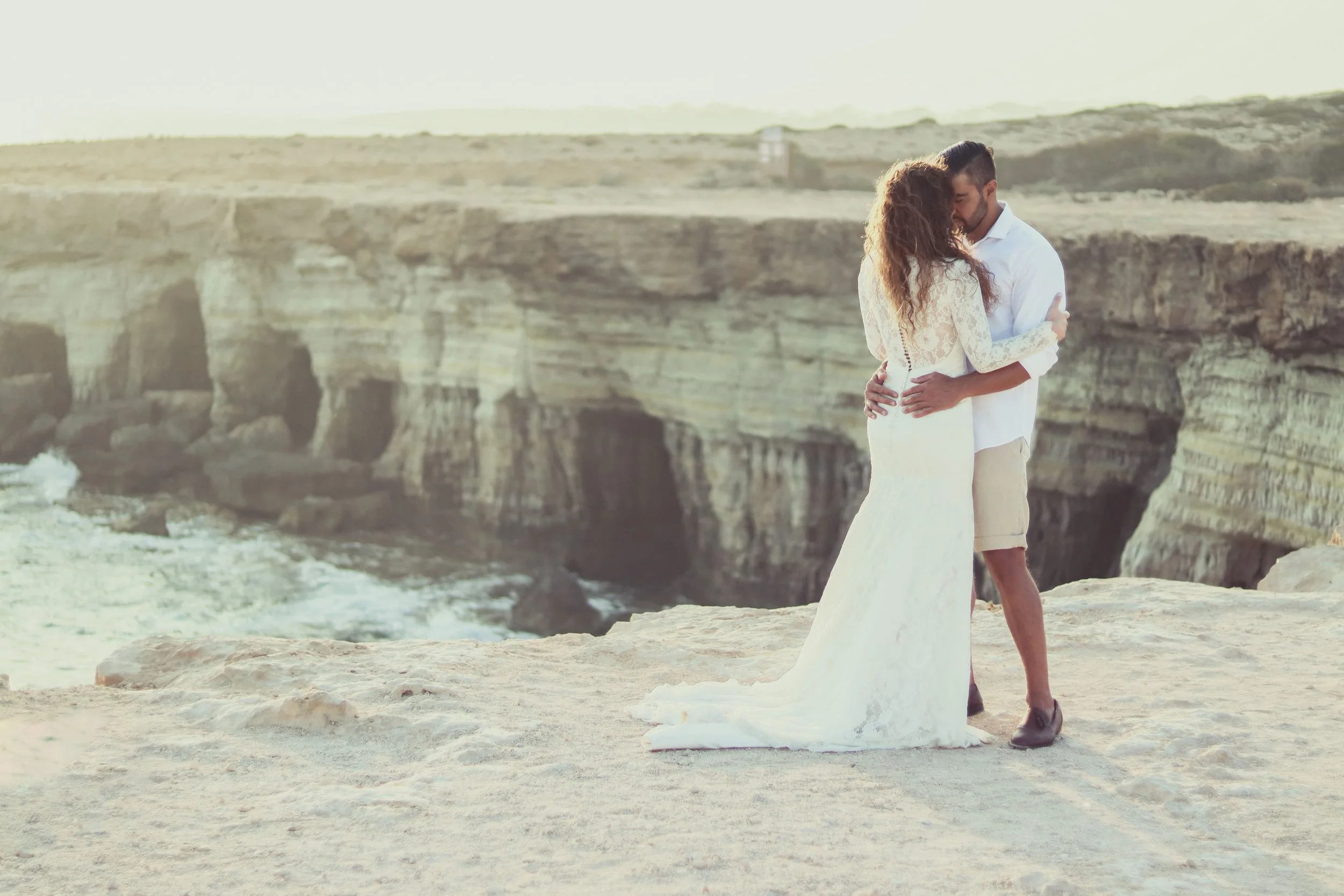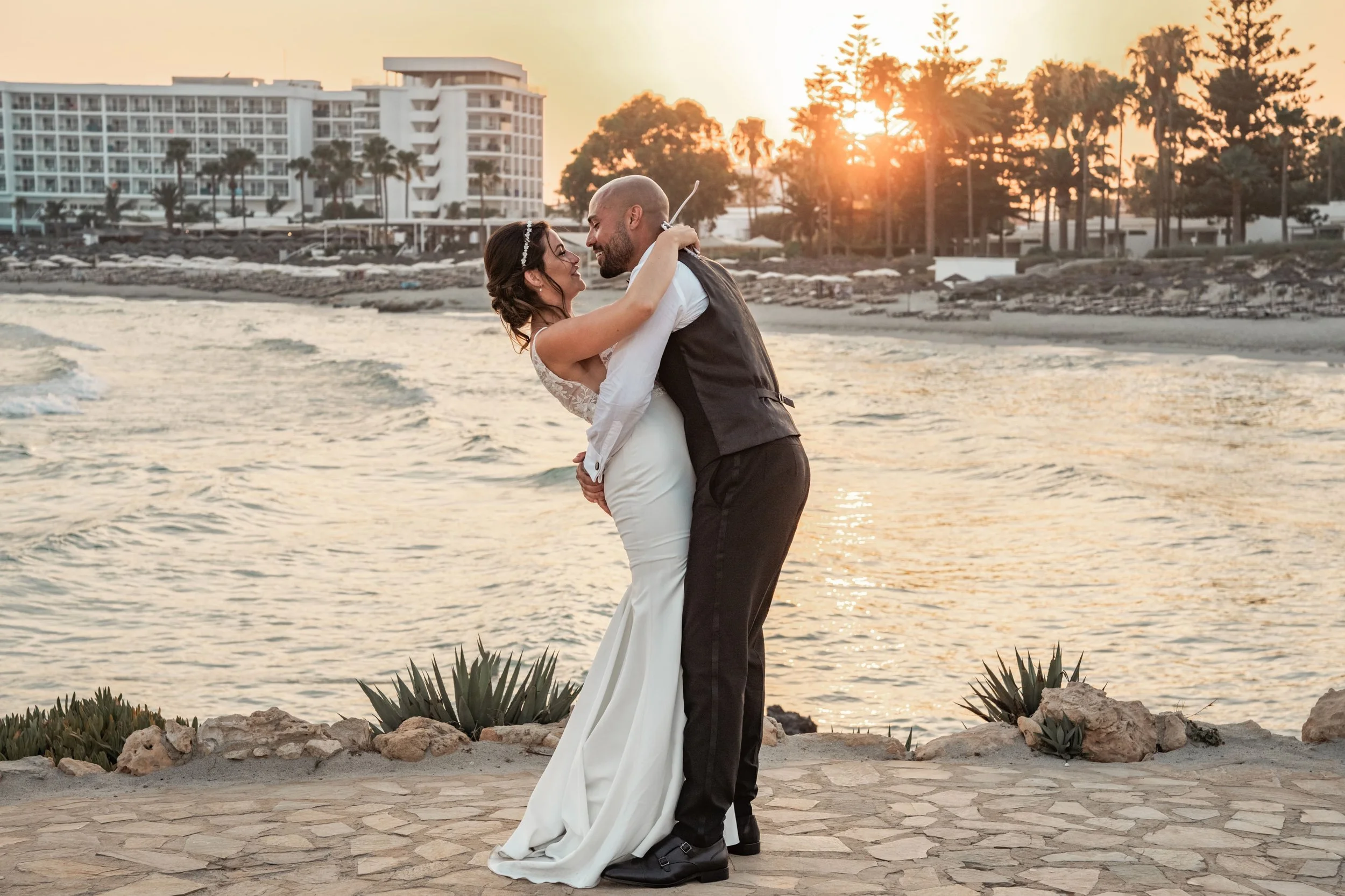 A bride and groom sharing a kiss on a rocky beach with a large cliff in the background during sunset.