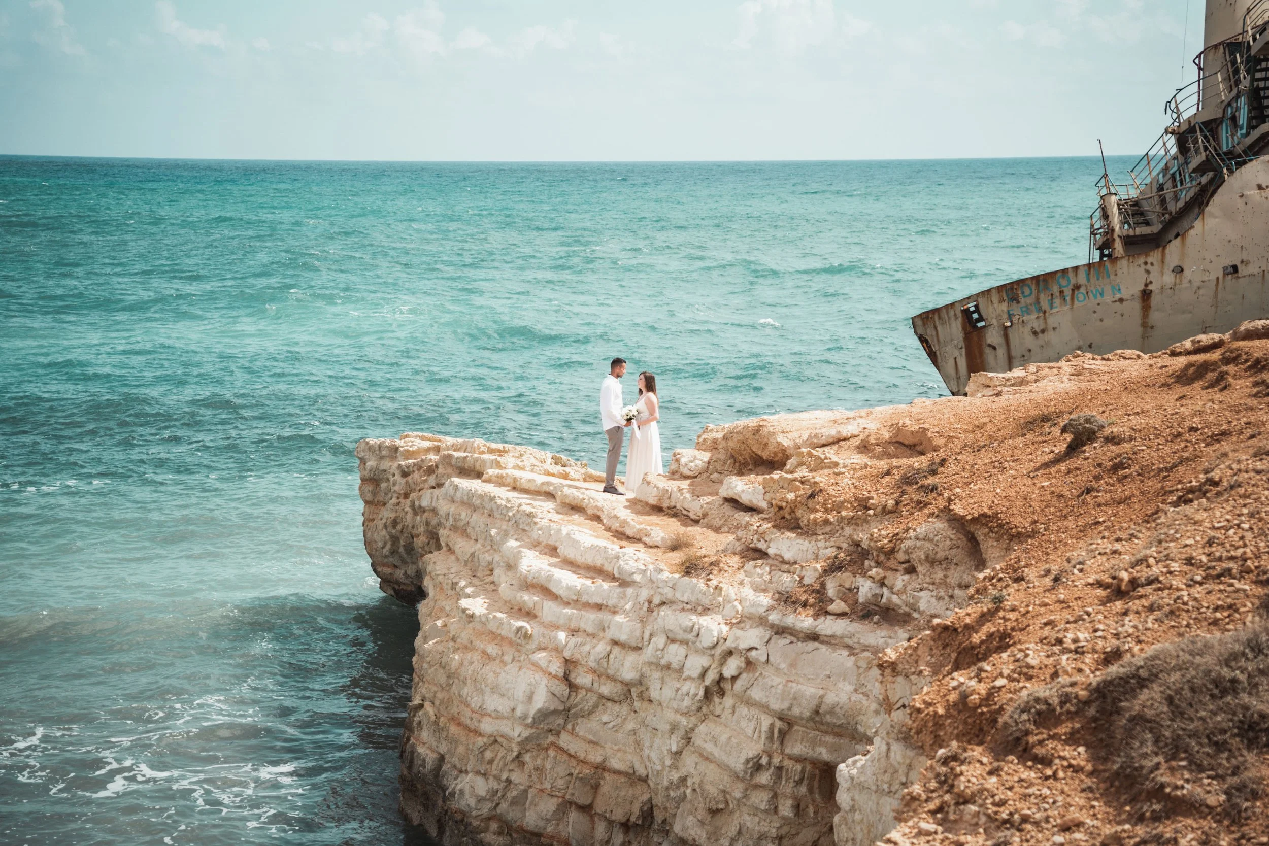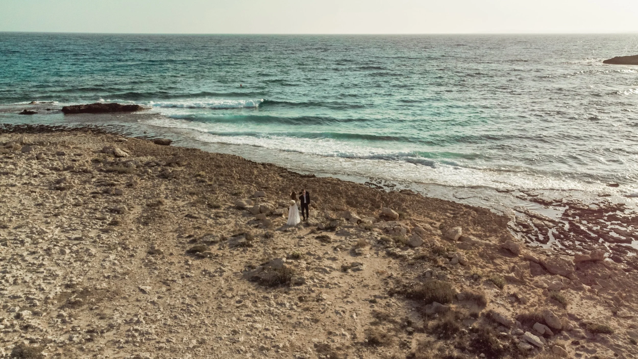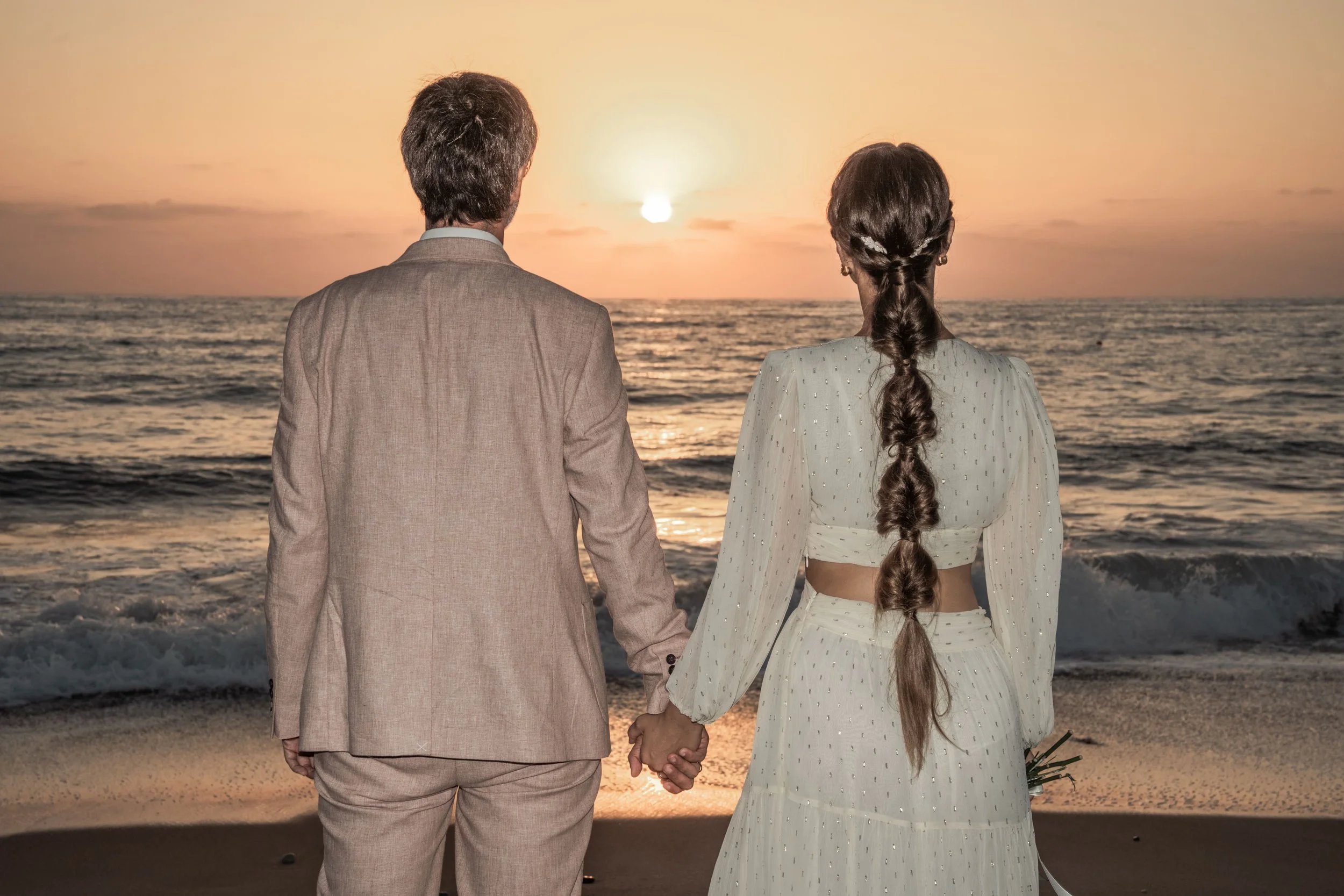 A bride and groom in wedding attire standing hand in hand by the seashore, facing each other, with the ocean and rocky coastline in the background.