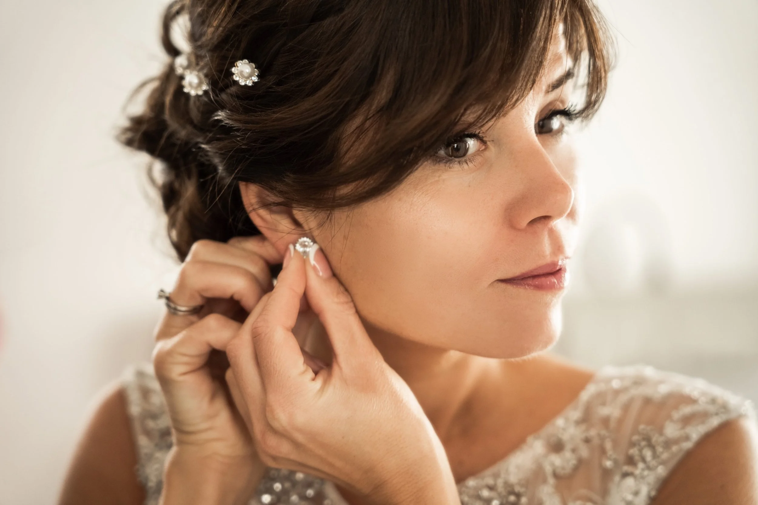 Close-up of a woman’s back as someone buttons up her lace wedding dress, with the woman's curly hair and jewelry visible.