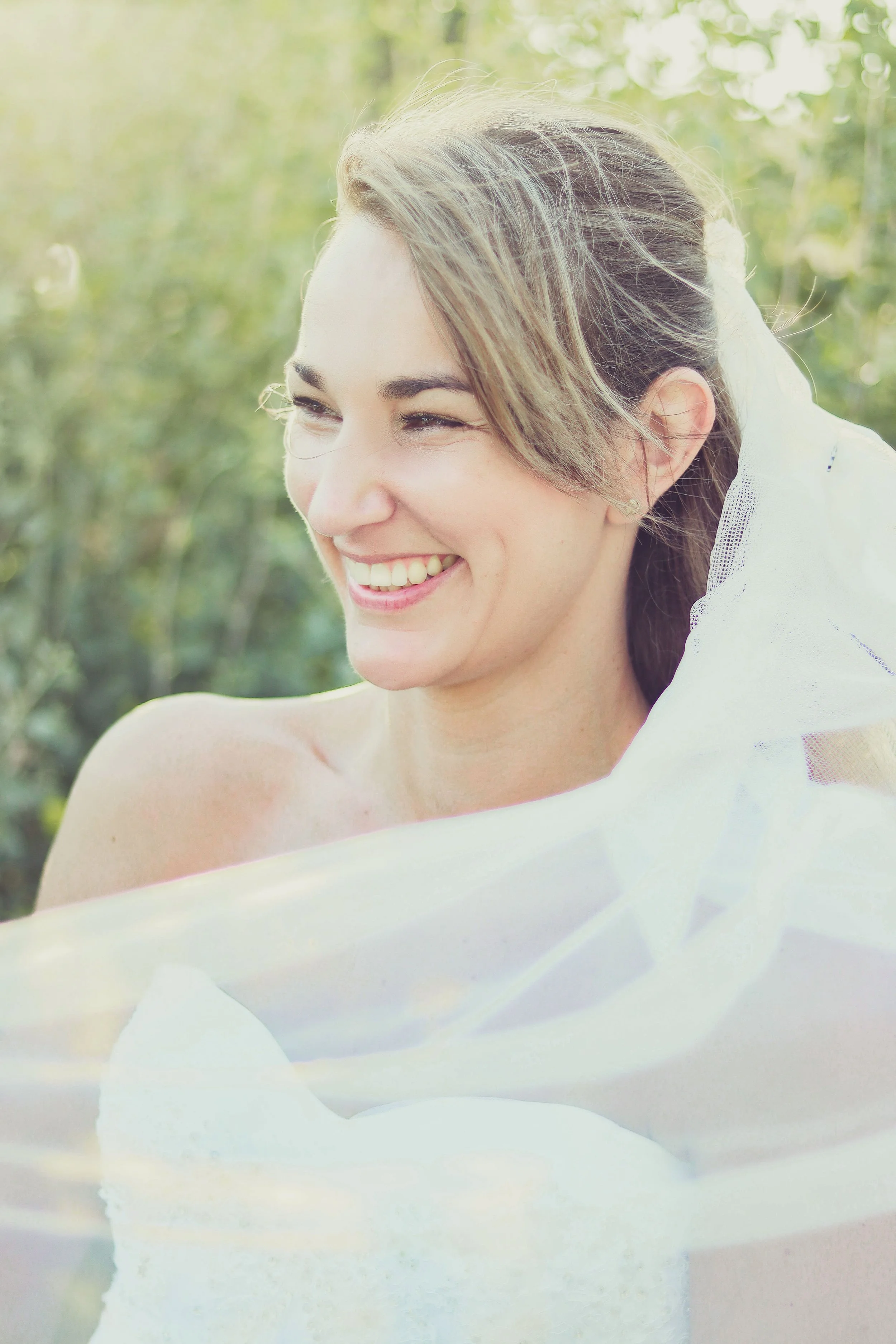 A bride with closed eyes, smiling gently, in an outdoor setting with sunlight, wearing a white wedding dress, earrings, and a necklace, with a white veil flowing behind her.