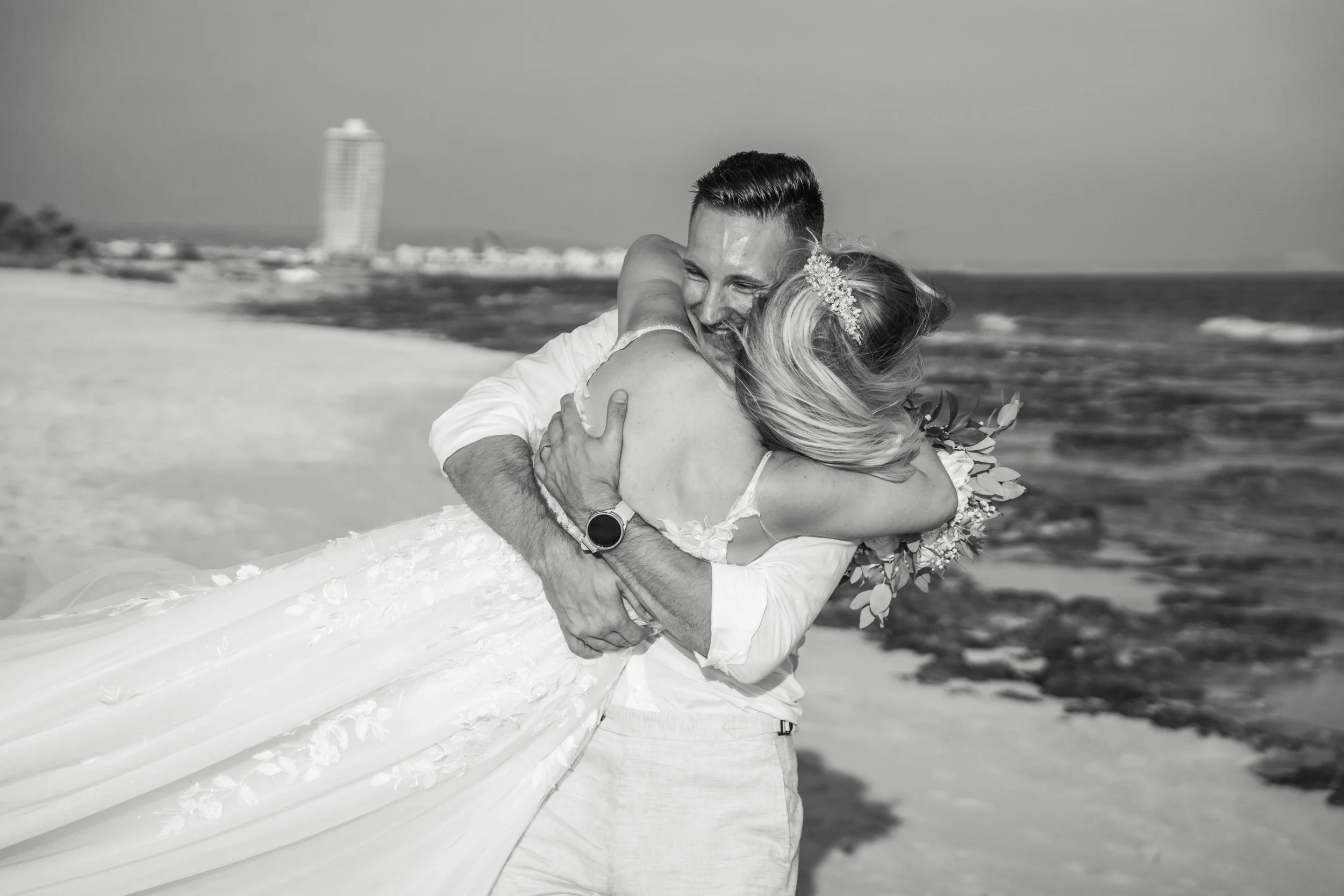 A woman and a man with dark hair in an embrace at the beach, with the woman smiling and the man wearing sunglasses.
