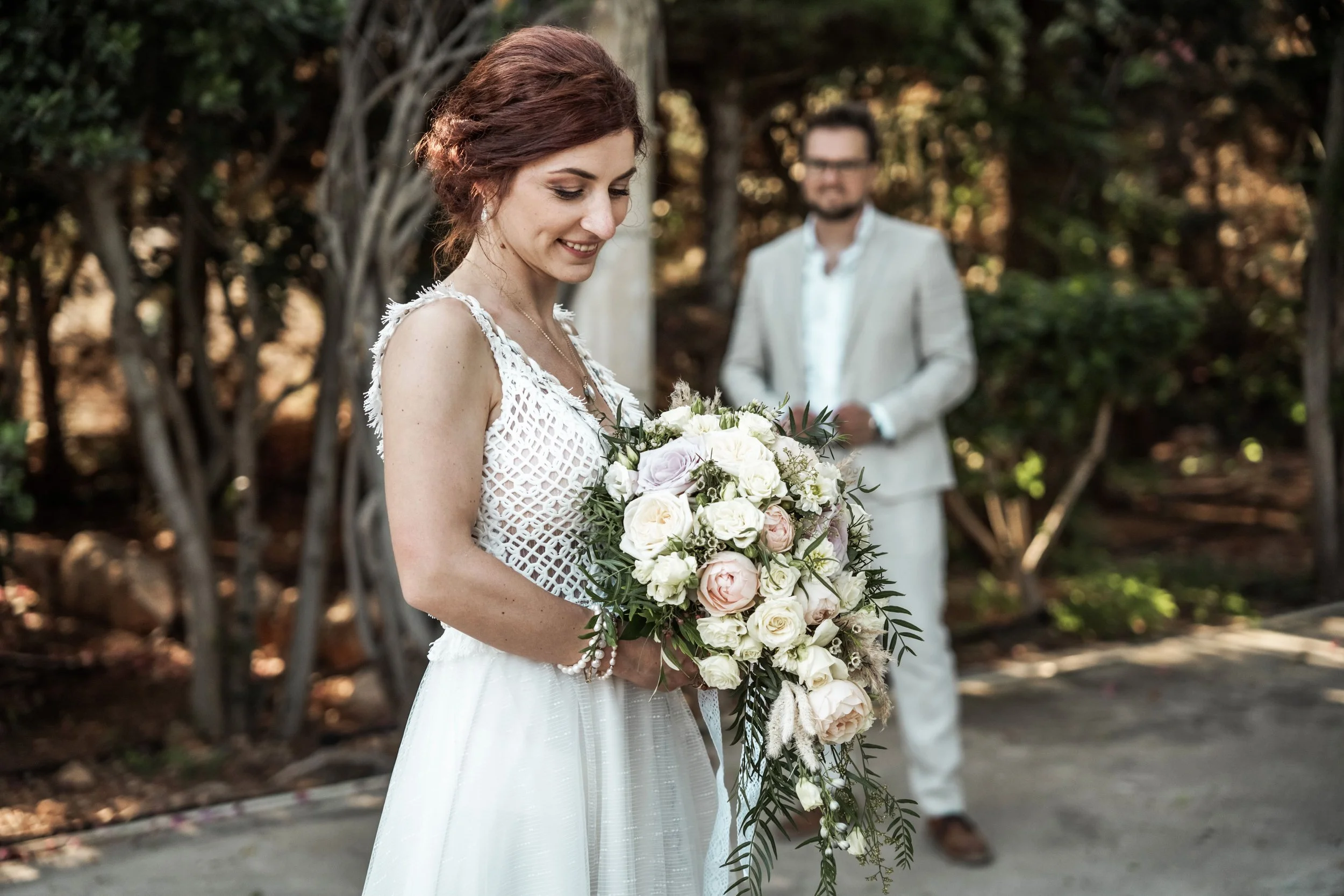 A bride and groom sharing a moment outdoors, the bride holding a bouquet of white and pink roses, with pink flowers in the foreground and trees in the background.