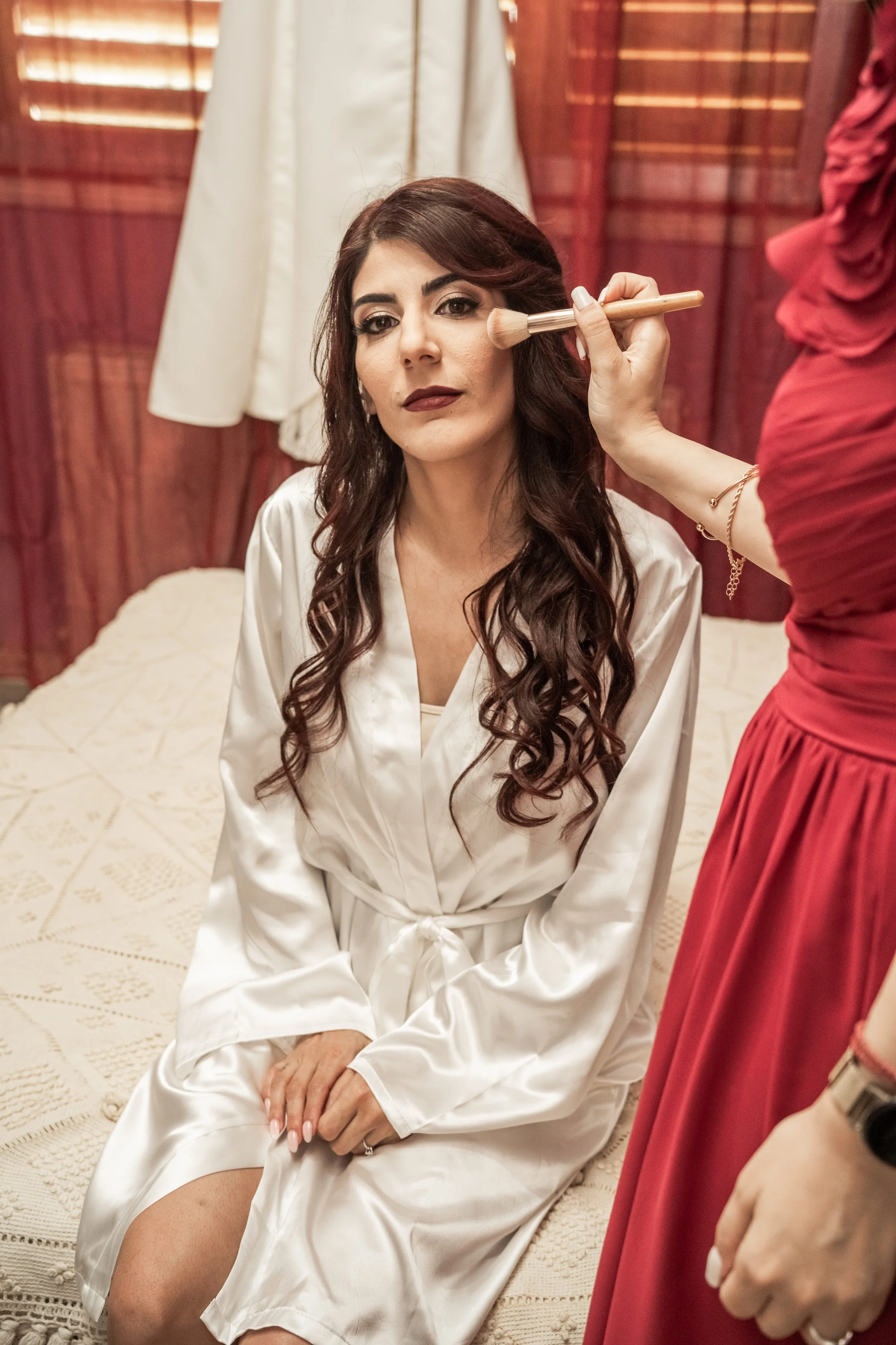 A woman with long, dark, curly hair having makeup applied by a makeup artist. She is wearing a white satin robe and sitting on a bed with a neutral expression.
