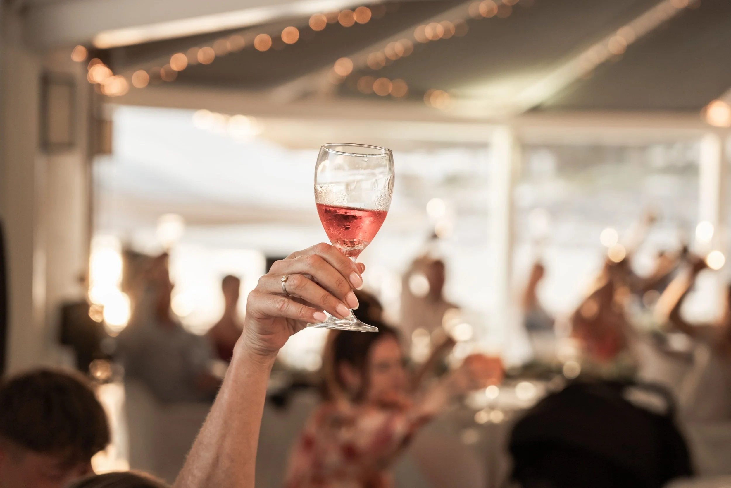 Group of people enjoying a celebration or party indoors, holding drinks and smiling, with a disco ball hanging from the ceiling and string lights.