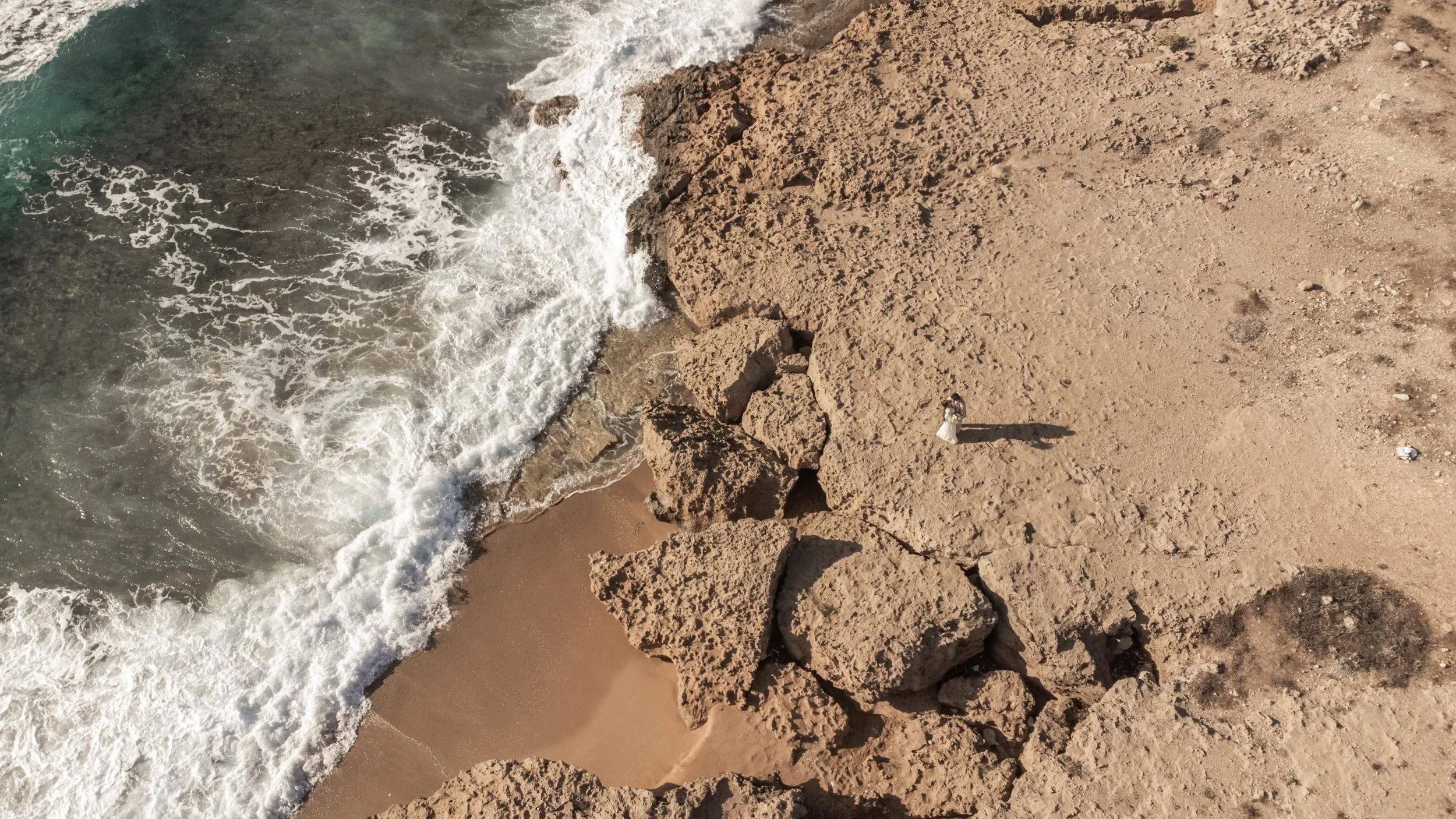 A couple lying on rocky ground in front of a textured stone wall, holding hands and looking at each other. The woman is wearing a white lace dress with spaghetti straps, and the man is dressed in a white button-up shirt and beige pants.