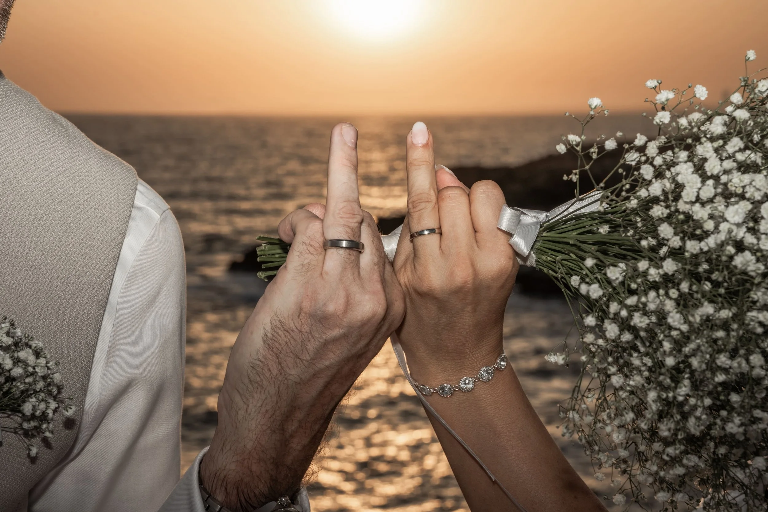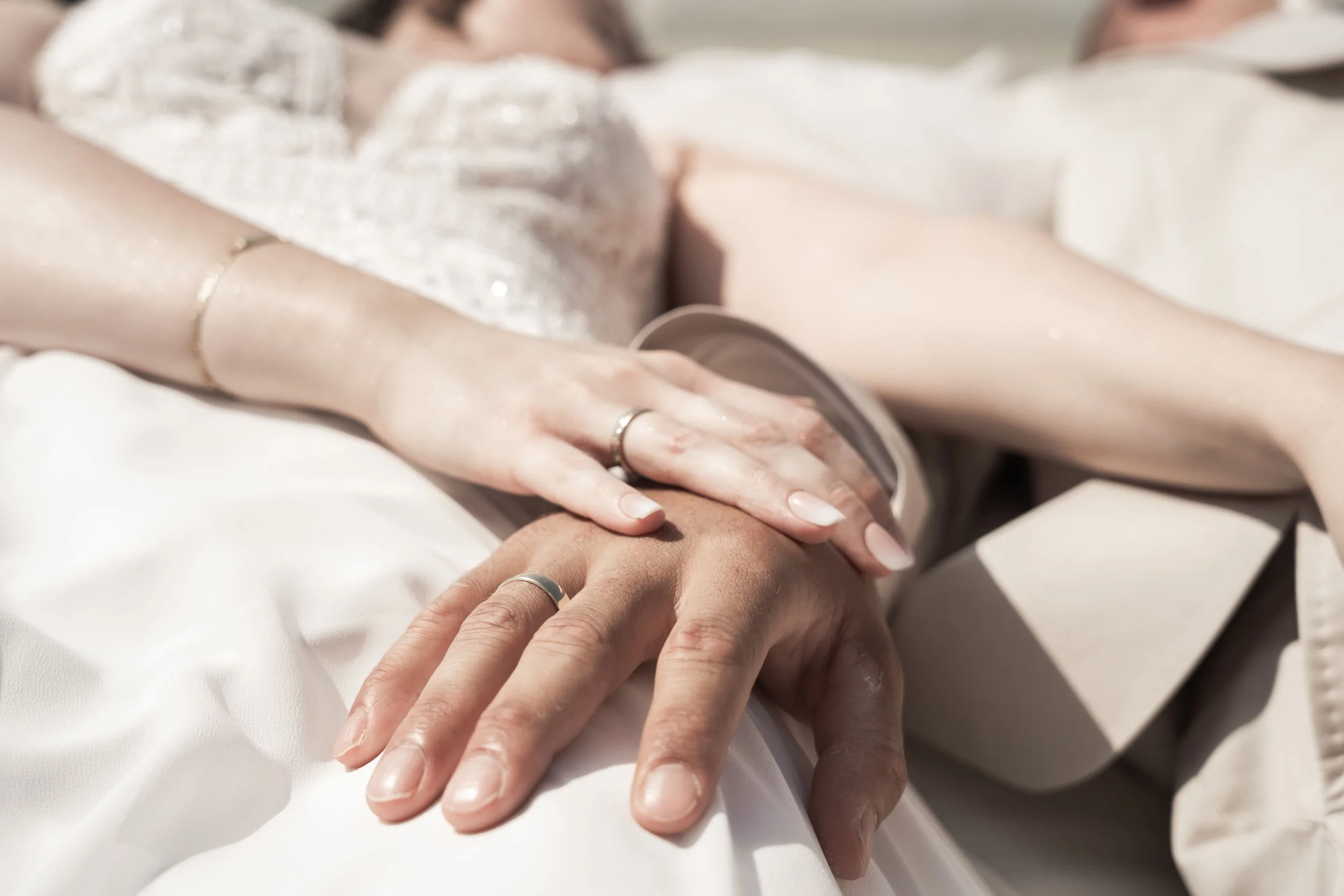 Close-up of a couple's hands showing wedding rings and jewelry, with the groom in a blue suit and the bride in a white dress.
