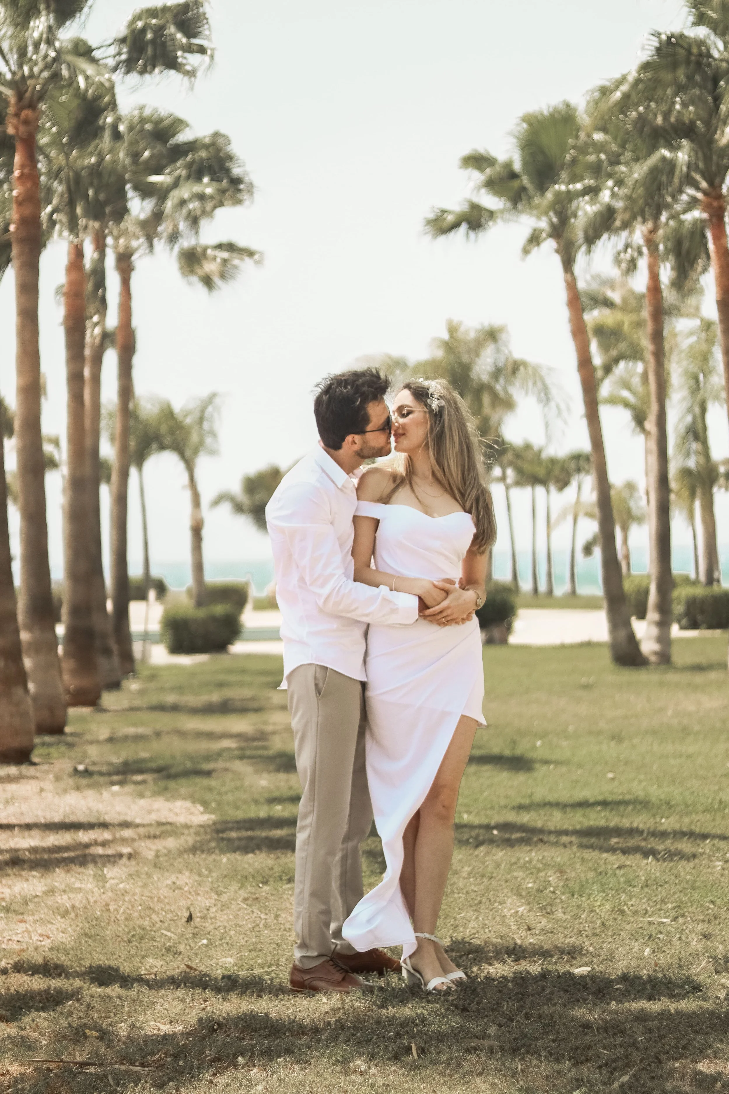 A couple kissing on the beach during a wedding or romantic event.
