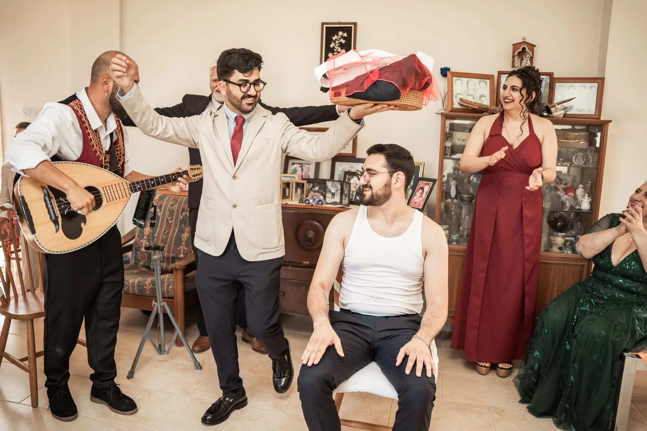 A bride and musician in a living room decorated for a celebration, with guests watching as the musician plays guitar.