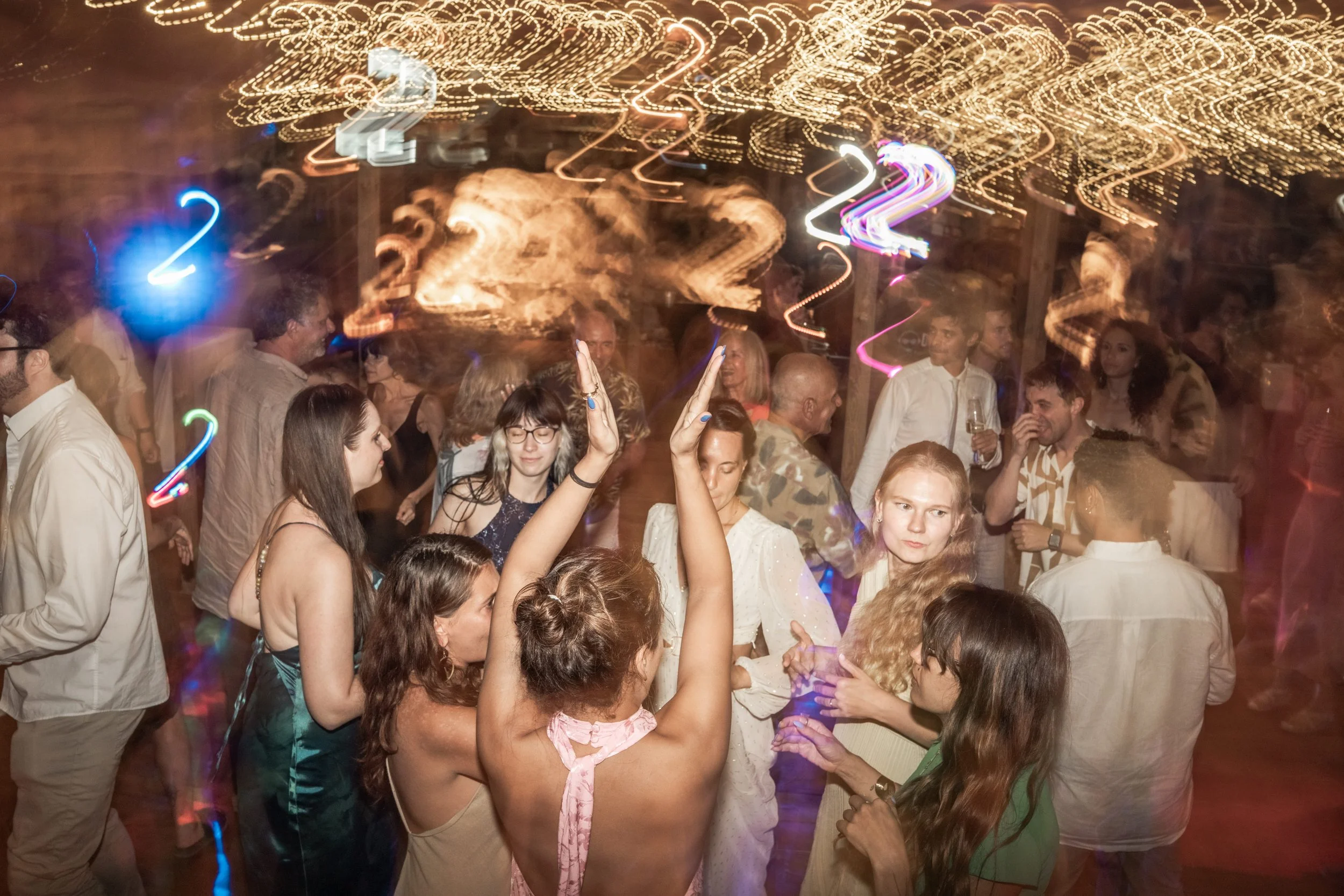 People dancing and celebrating at a party with colorful light streaks.